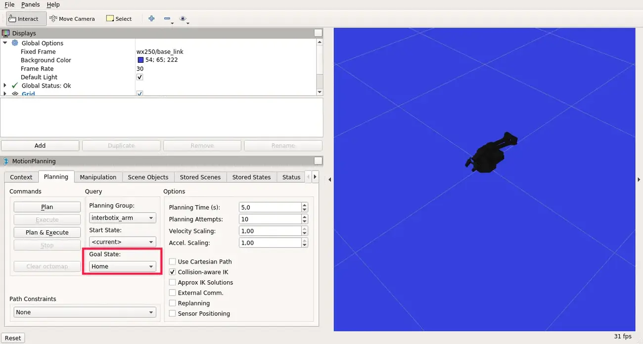 On the MotionPlanning panel, click on the Planning tab, choose interbotix_arm for the Planning Group and <current> for the Start State (to operate with the gripper, change the Planning Group to interbotix_gripper)
